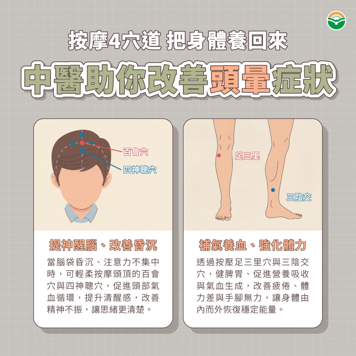 - 可按摩足三里、三陰交、百會、四神聰,幫助氣血上行、提振精神