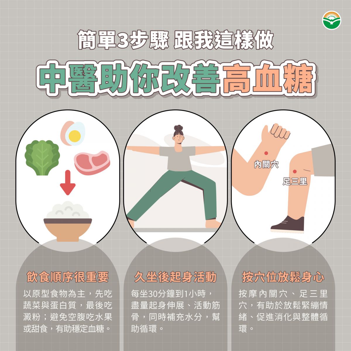 以原型食物為主,進食時先吃蔬菜與蛋白質,最後再吃澱粉;避免空腹吃水果或甜食,有助於穩定血糖。