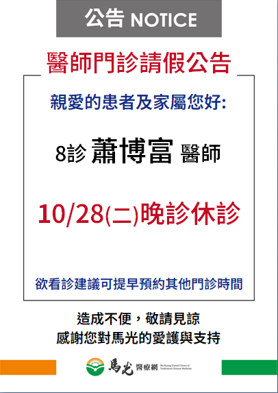 【屏東院】蕭博富醫師10/28(二)晚診休診,欲看診可提早或往後預約 !