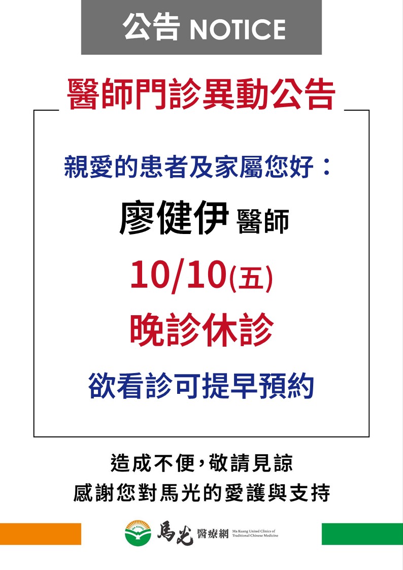 【崇學院】廖健伊醫師10/10(五)晚診休診,欲看診可提早預約。