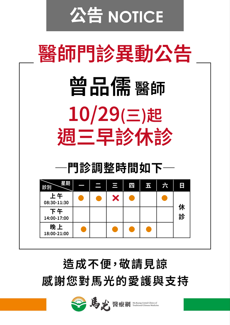 【崇學院】曾品儒醫師10/29(三)起,門診調整時間如下,欲看診可提早預約。