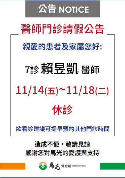 【屏東院】賴昱凱醫師11/14(五)~11/18(二)休診,欲看診可提早或往後預約 !