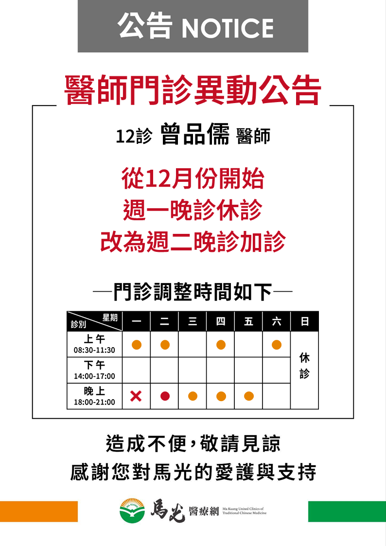 【崇學院】 曾品儒醫師從12月份開始,週一晚診休診,改為週二晚診加診,欲看診民眾可提前或往後預約。