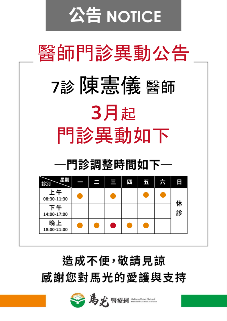 【東港院】陳憲儀醫師3月起門診異動如下,欲看診可提早預約