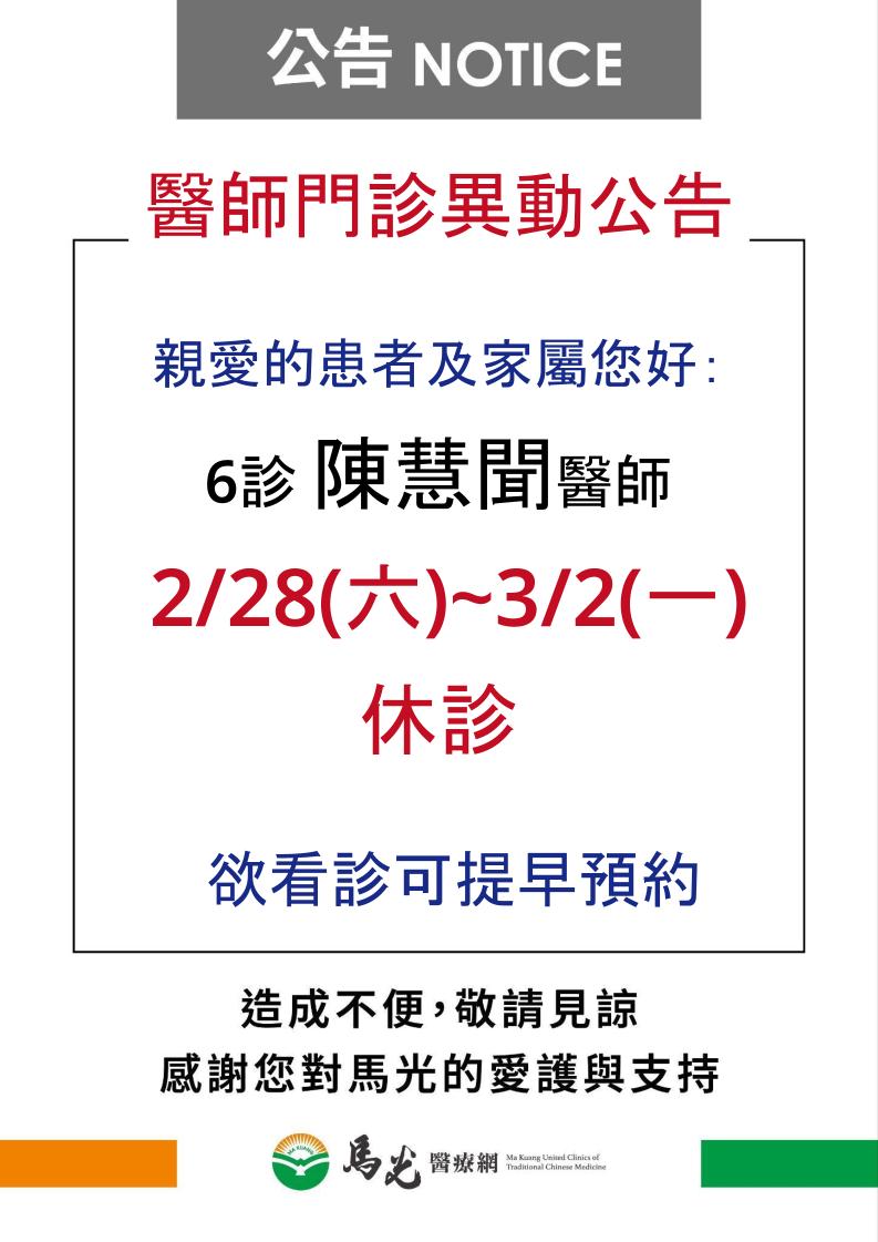 【東霖院】陳慧聞醫師2/28(六)~3/2(一)休診,欲看診可提早預約