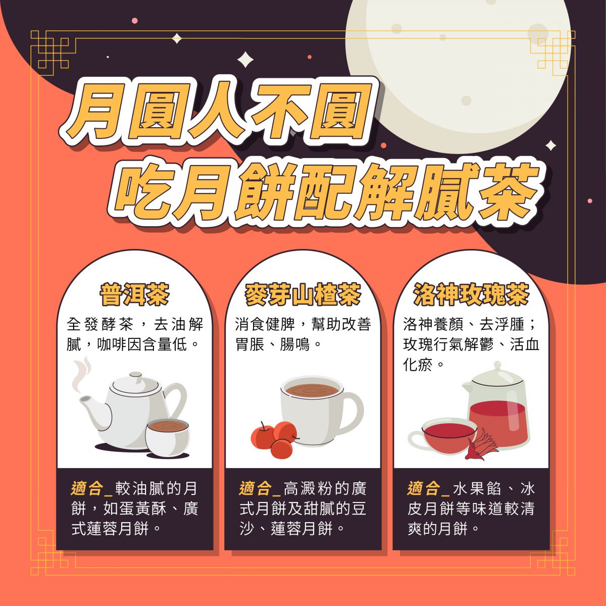 普洱茶是全發酵茶,能幫助去油解膩,咖啡因含量低,特別適合搭配比較油膩的月餅,如蛋黃酥、廣式蓮蓉月餅。