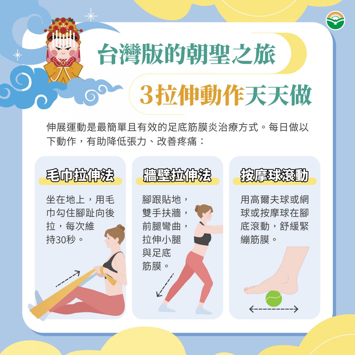 伸展運動是最簡單且有效的足底筋膜炎治療方式。每日做以下動作,有助降低張力、改善疼痛: