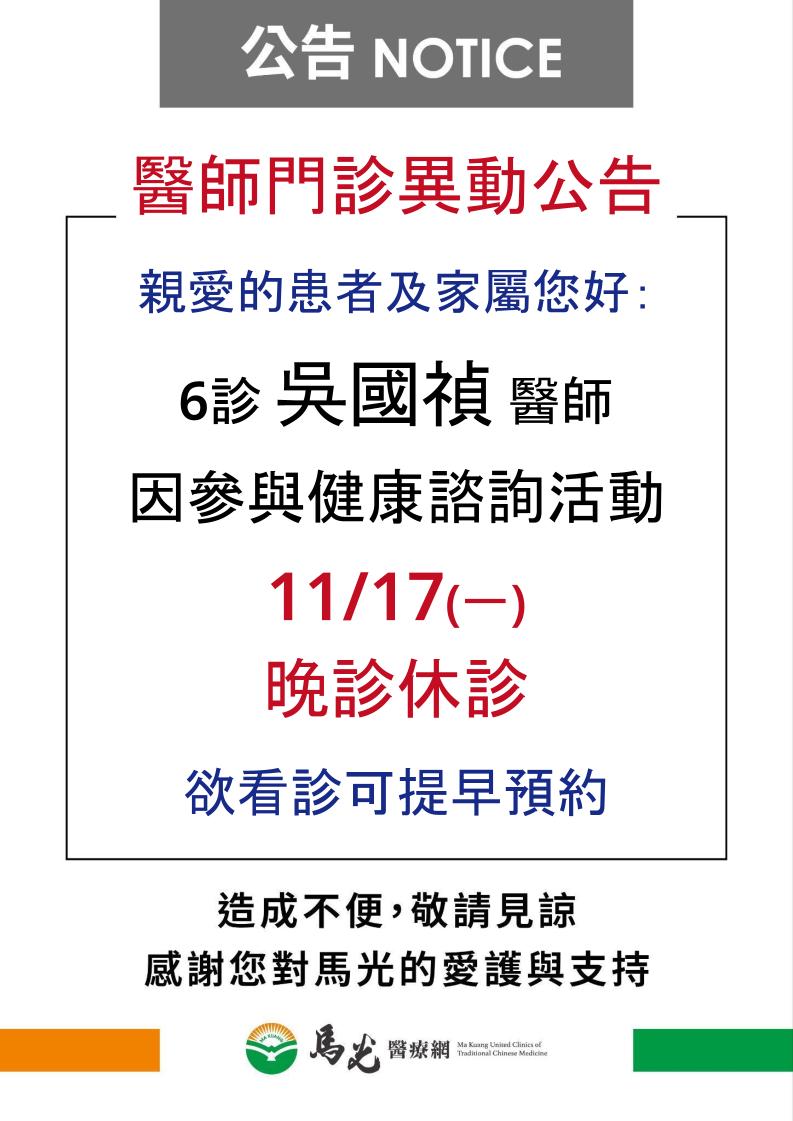 【成功院】吳國禎醫師因參與健康諮詢活動,11/17(一)晚診休診,欲看診可提早預約