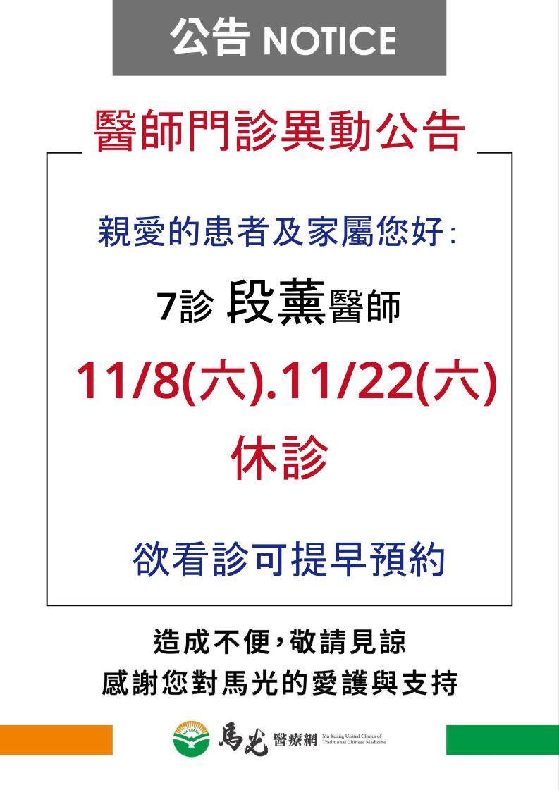【東霖院】段薰醫師11/8(六)、11/22(六)休診,欲看診可提早或往後預約 !