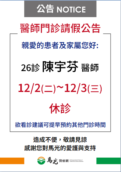 【屏東院】陳宇芬醫師12/02(二)~12/03(三)休診,欲看診可提早或往後預約 !