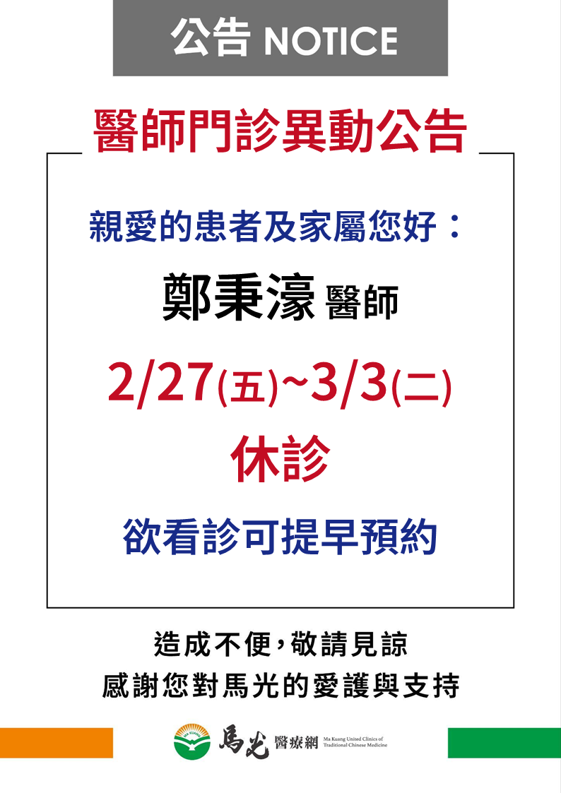 【崇學院】鄭秉濠醫師2/27(三)~3/3(二)休診,欲看診民眾可提前或往後預約!