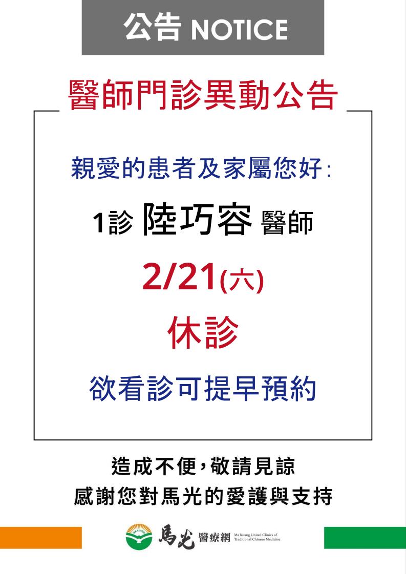 【成功院】陸巧容醫師2/21(六)休診,欲看診可提早預約