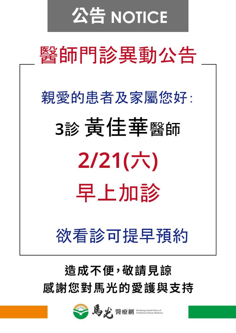 【東霖院】黃佳華醫師2/21(六)早診加診,欲看診可提早預約