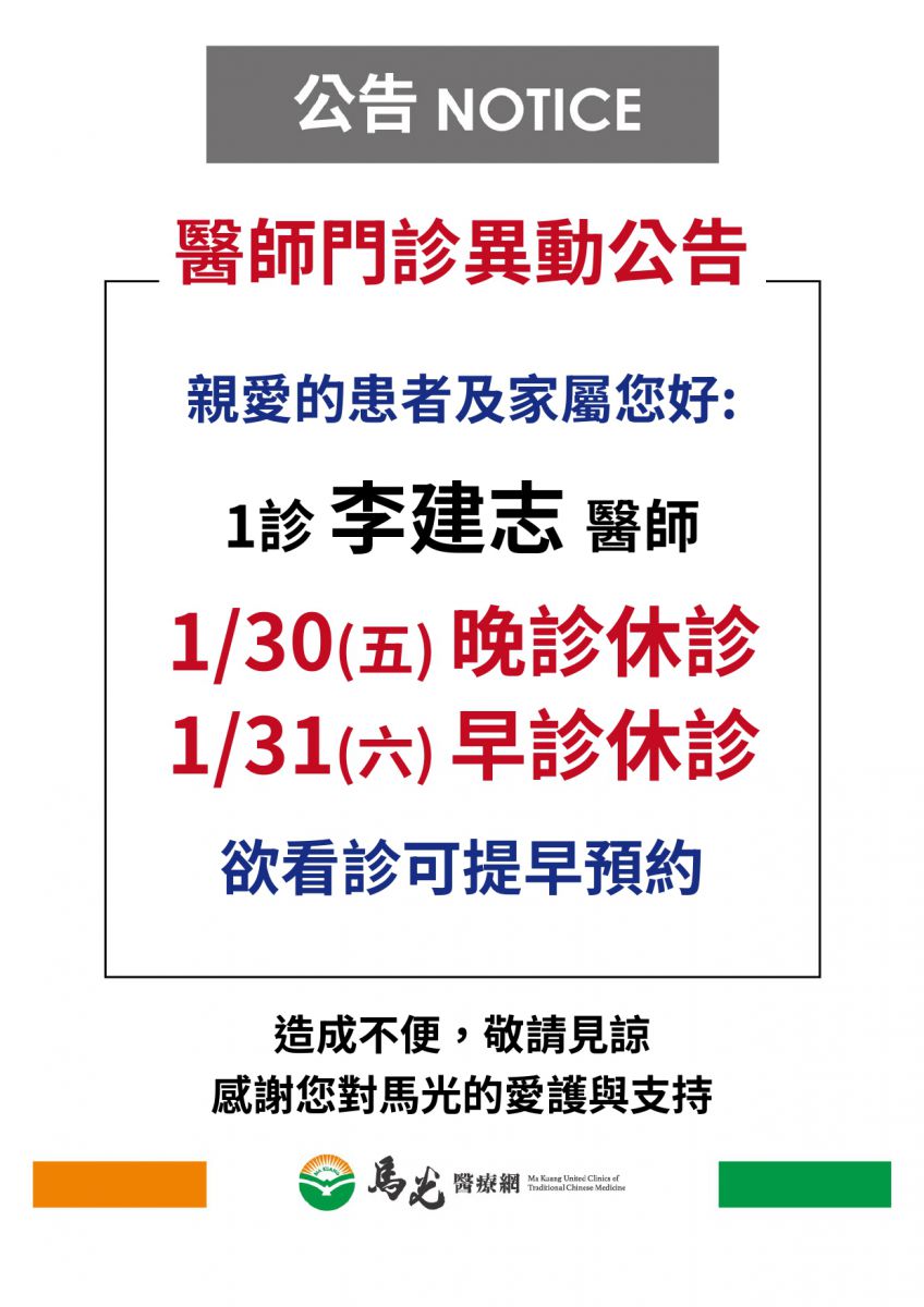【民權院】李建志醫師 1/31(五)晚診休診, 1/31(六)早診休診,欲看診可提前預約。