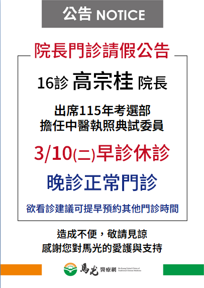 【屏東院】高宗桂院長因出席115年考選部擔任中醫執照典試委員,3/10(二)早診休診、晚診正常門診,欲看診可提早或往後預約 !