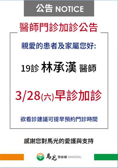 【屏東院】林承漢醫師3/28(六)早診加診,欲看診可提早或往後預約 !