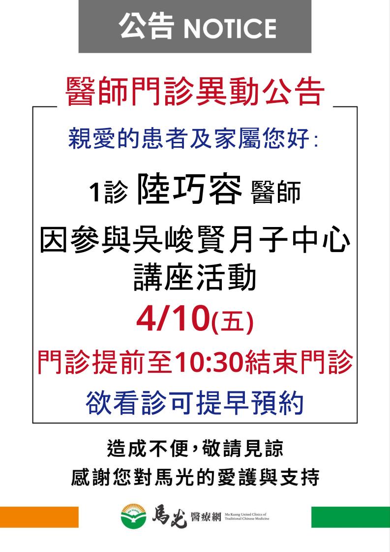 【成功院】陸巧容醫師4/10(五) 因參與吳峻賢月子中心講座活動,門診提前至10:30結束門診,欲看診可提早預約