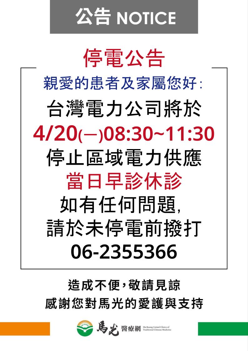 【成功院】台灣電力公司將於 4/20(一)08:30~11:30,停止區域電力供應,當日早診休診,如有任何問題, 請於未停電前撥打 06-2355366