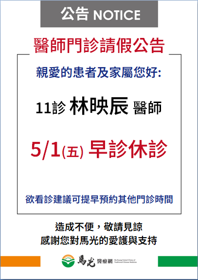 【屏東院】林映辰醫師5/1(五)早診休診,欲看診可提早或往後預約 !