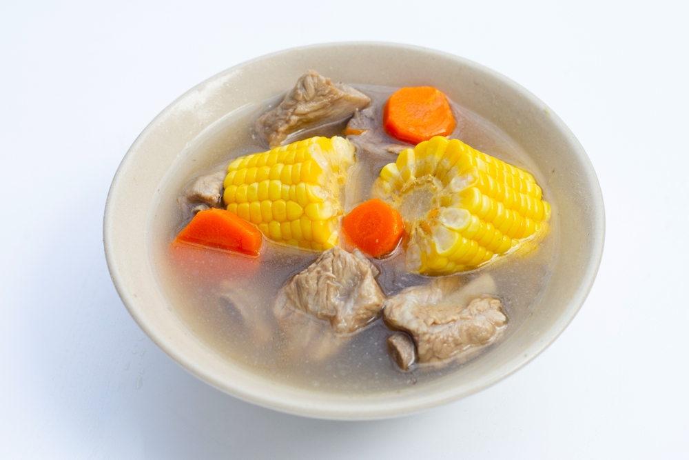 材料:雞肉/排骨 300 克、紅蘿蔔 1 條、玉米 3 根、水 1800cc、生薑 2 片、鹽酌量。