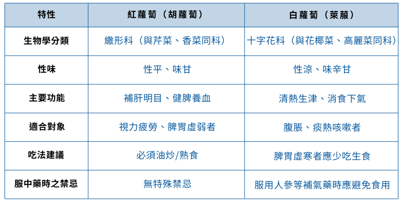 至於常被問到的「紅白蘿蔔能不能一起煮」,其實只要煮熟,紅蘿蔔中的分解酶就會被破壞,不必過度擔心;加上紅蘿蔔性質偏補、白蘿蔔偏清涼,搭配反而能取得平衡,一般家常湯品如紅白蘿蔔排骨湯,安心同煮、安心食用就好。