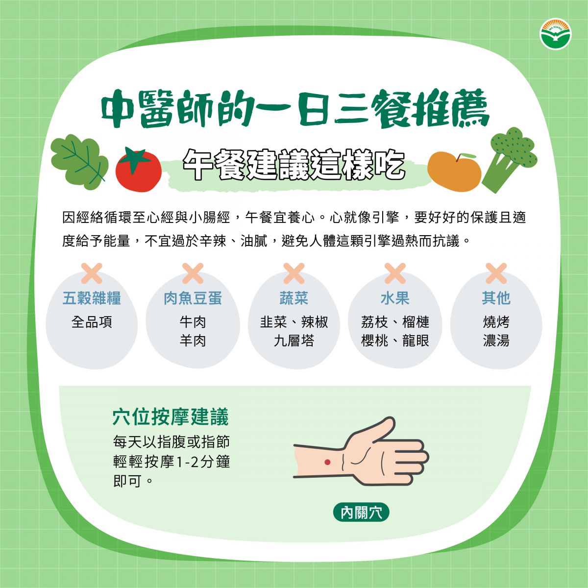 午餐時間因經絡循環至心經與小腸經,中醫云「心與小腸相表裏」,故午餐宜養心。該如何養心呢?簡單而言,心就好比一台車子之中最重要的零件「引擎」,引擎要好好的保護,適度的給予潤滑,不可以過度的刺激以免過熱;「心」也是一樣的,需要適度的給予能量,不宜過於辛辣、過於油膩的東西,避免人體這顆引擎過熱而抗議。