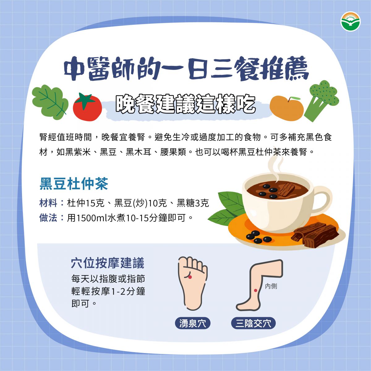 晚餐時腎經值班時間,此時宜養腎。選擇上避免過於生冷或過度加工的食物。可以多補充些黑色食材,如黑紫米、黑豆、黑木耳、腰果類食物。也可以喝杯黑豆杜仲茶來養腎。