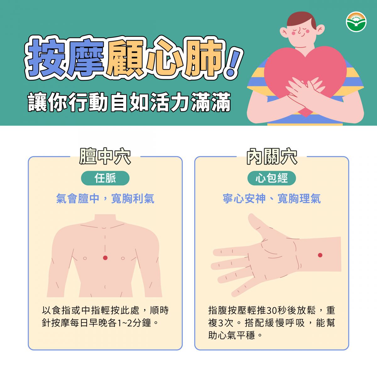 中醫講「氣行則血行」,若氣血運行順暢,心肺自然強健。以下兩個穴位簡單易學,可每日按壓或配合丹田深呼吸練習:
