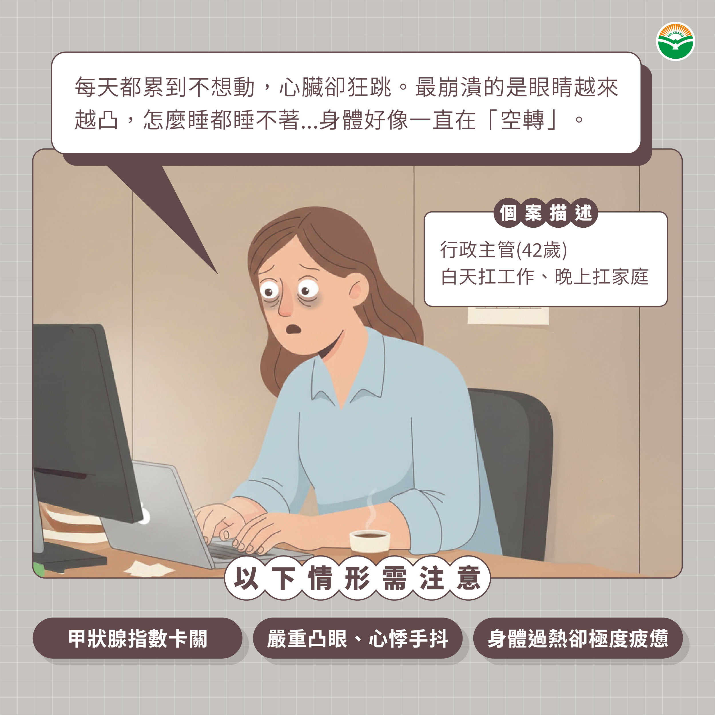 明明累到不行,心臟卻一直狂跳,眼睛還越來越凸、又乾又脹?這篇用一位42歲行政主管的甲亢案例帶你看:很多人不是「不夠補」,而是身體像引擎過熱、冷卻水又不夠,越撐越耗。中醫會從疏肝解鬱、降火滋陰、調腸胃到軟堅散結一起處理,讓心悸、失眠、胃酸逆流和眼睛不適一步步緩下來。也整理日常飲食、作息與穴位按摩,幫你把身體拉回穩定。