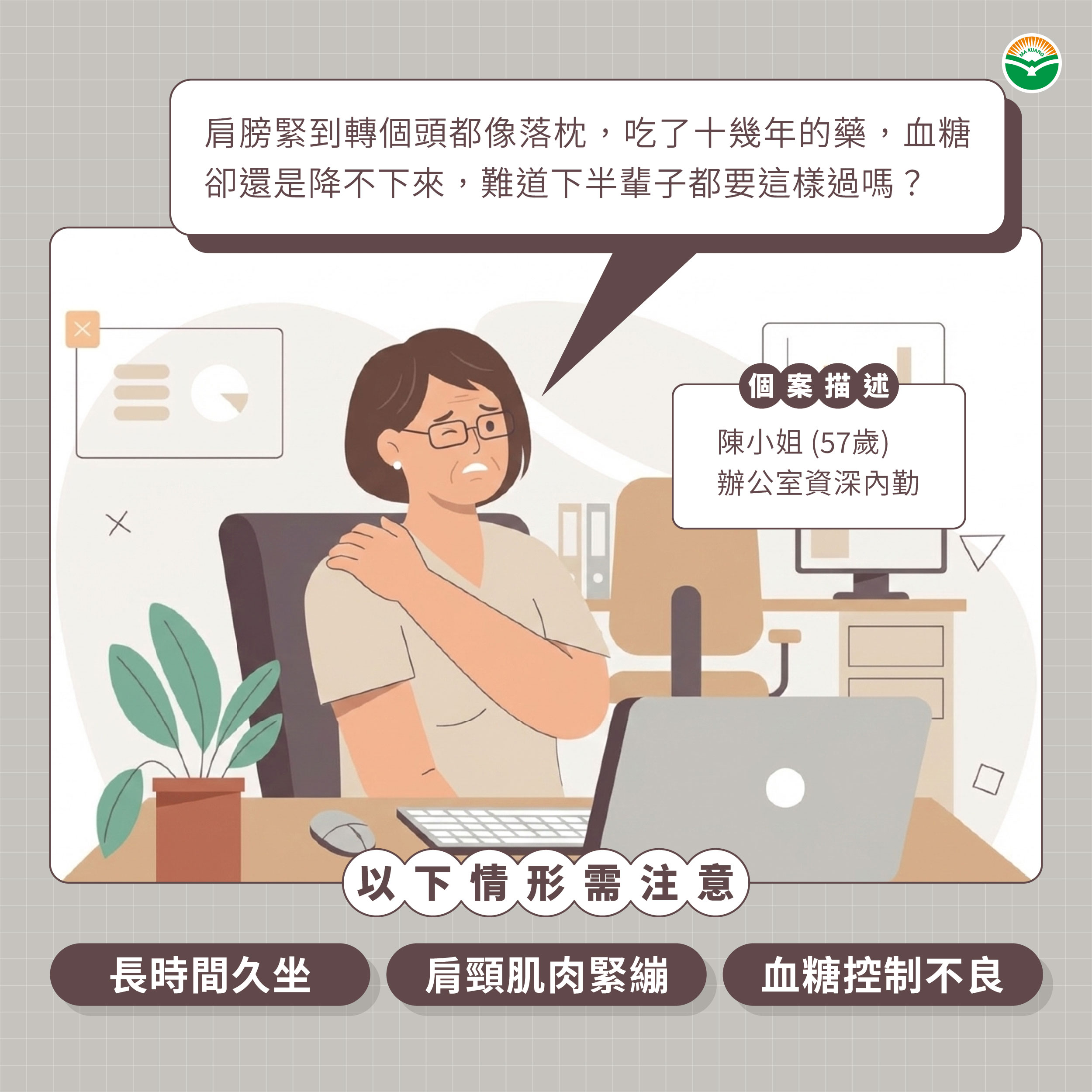 久坐上班、壓力又大,很容易變成「全身緊、哪裡都痛」,血糖也跟著難控制。這篇用一位57歲行政人員的案例說明:肩頸痛、膝蓋退化、長期血糖偏高,不是只有吃藥或貼藥布就能解決。中醫會從體質下手,常見是「肝鬱+脾虛」,先用針灸把緊繃放鬆,再搭配中藥疏肝健脾,讓代謝慢慢回到軌道。文末也整理飲食順序、久坐活動與穴位按摩,幫你把改善穩住。