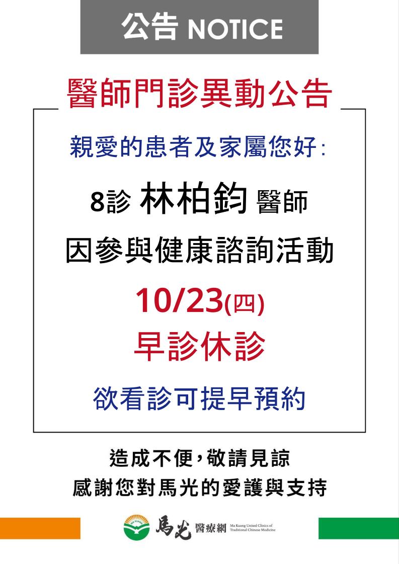 【成功院】林柏鈞醫師因參與健康諮詢活動,10/23(四)早診休診,欲看診可提早預約
