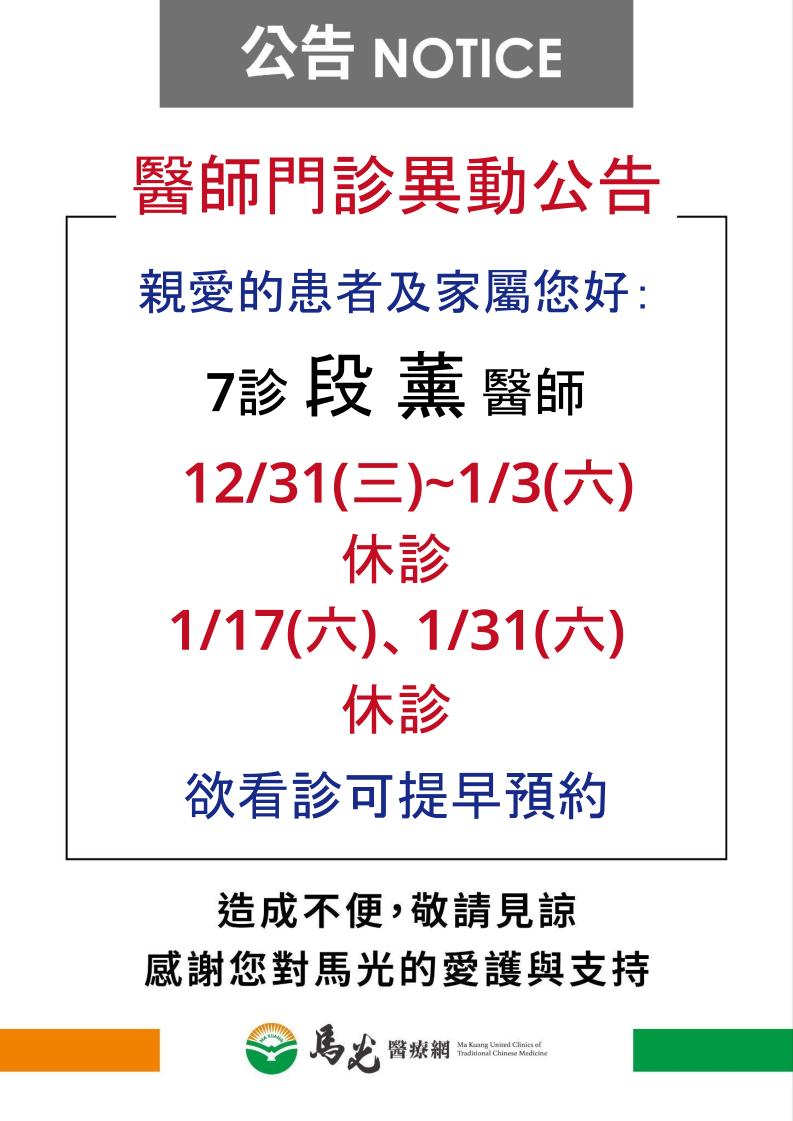 【東霖院】段薰醫師12/31(三)~115/1/3(六)休診、1/17(六)、1/31(六)休診;欲看診可提早或往後預約 !