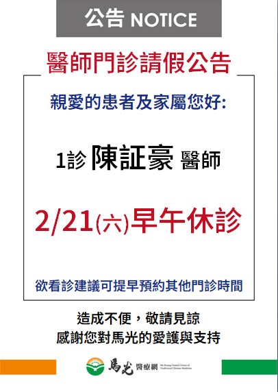 【屏東院】陳証豪醫師2/21(六)早午休診,欲看診可提早或往後預約 !
