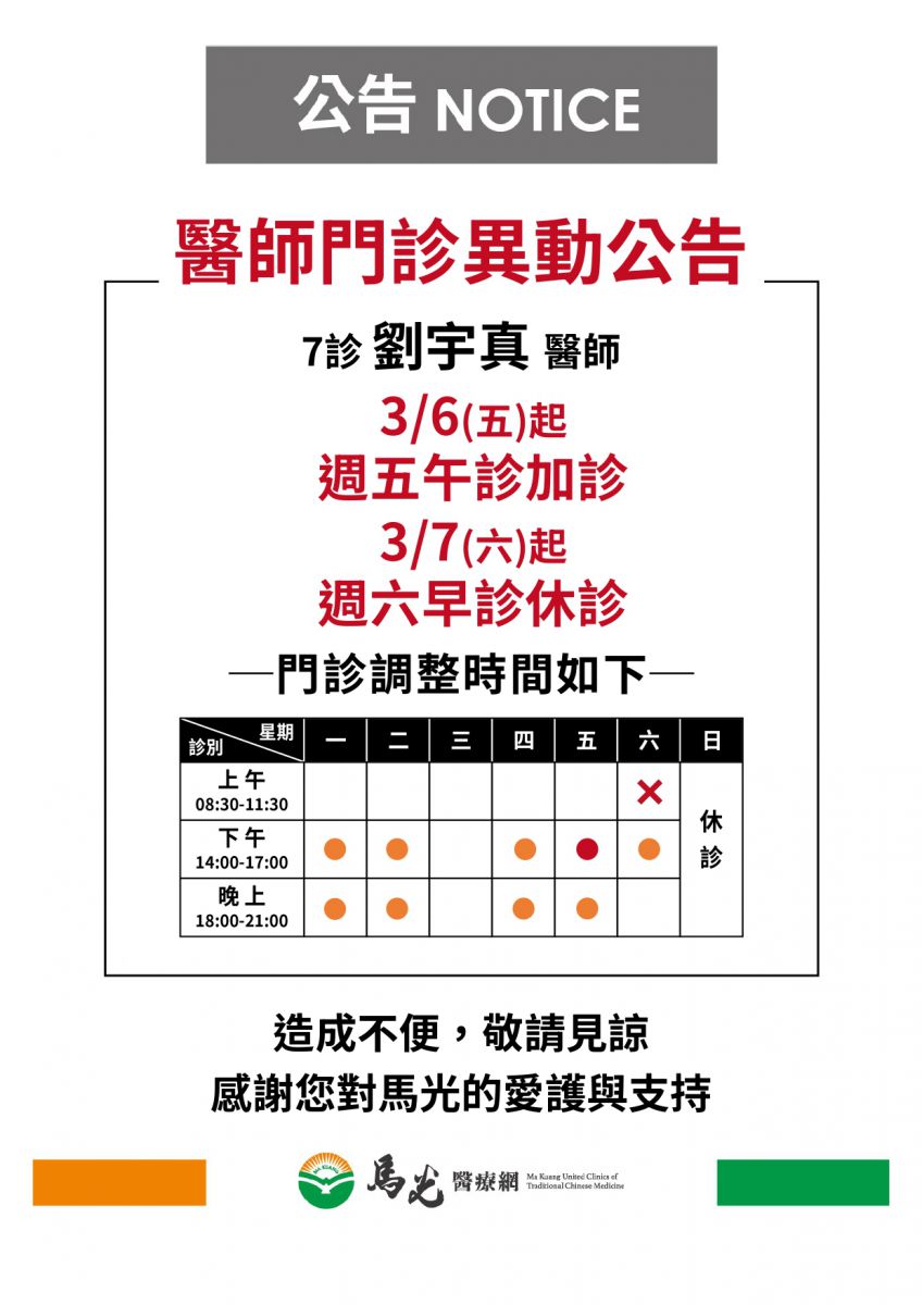 【民權院】劉宇真醫師3/6(五)起週五午診加診,3/7(六)起週六早診休診,門診異動如下,欲看診可提早預約。