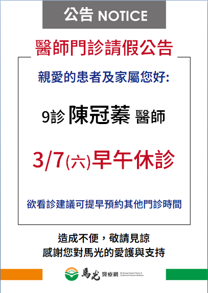 【屏東院】陳冠蓁醫師3/7(六)早午診休診,欲看診可提早或往後預約 !