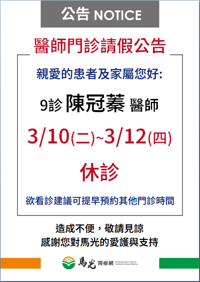 【屏東院】陳冠蓁醫師3/10(二)~3/12(六)休診,欲看診可提早或往後預約 !