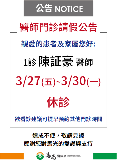 【屏東院】陳証豪醫師3/27(五)~3/30(一)休診,欲看診可提早或往後預約 !