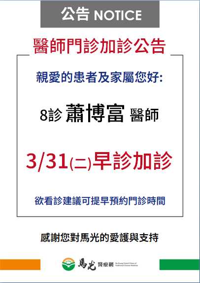 【屏東院】蕭博富醫師3/31(二)早診加診,欲看診可提早或往後預約 !