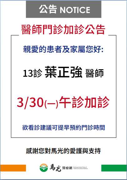 【屏東院】葉正強醫師3/30(一)午診加診,欲看診可提早或往後預約 !