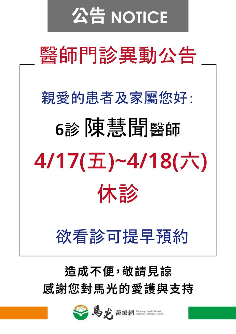 【東霖院】陳慧聞醫師4/17(五)~4/18(六)休診,欲看診可提早或往後預約 !