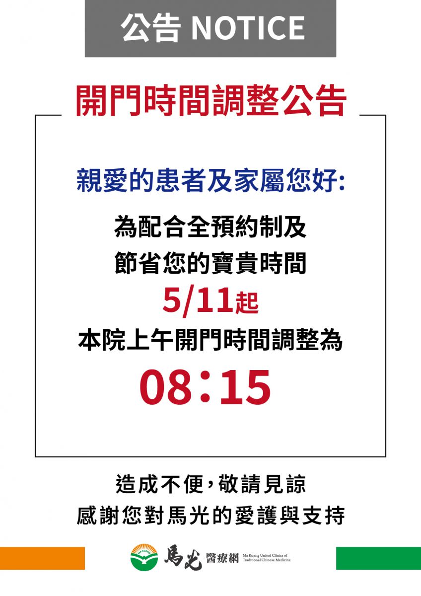 【東霖院】為配合全預約制~自5/11起本院上午開門時間調整為08:15